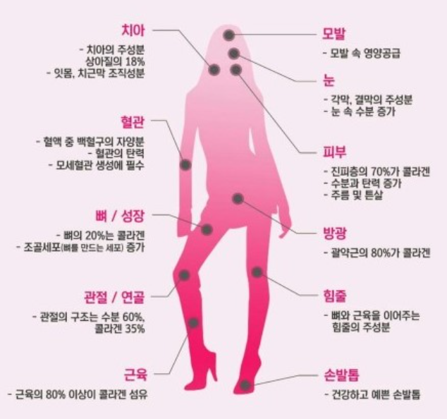 - 근육 손상 예방: 콜라겐이 근육 조직을 보호하여 운동으로 인한 근육 손상을 줄일 수 있다는 보고가 있습니다.