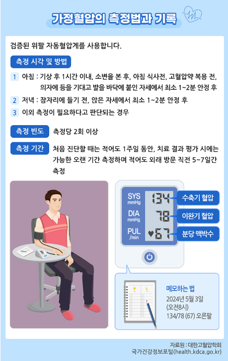 3. 가정혈압 측정: 환자가 집에서 직접 혈압을 측정하는 방법으로, 일상생활에서의 실제 혈압을 파악하는 데 도움이 됩니다. 아침과 저녁에 각각 2회씩 측정하여 기록합니다.