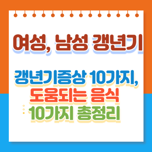 갱년기는 여성의 삶에서 필연적으로 찾아오는 시기입니다. 난소기능저하로 인해 여성 호르몬 분비량이 감소하며 신체적, 정신적 변화를 겪게 됩니다. 갱년기 증상은 개민마다 다르게 나타나지만 흔히 나타나는 증상이 있습니다. 이 글에서는 갱년기에 나타나는 증상 10가지와 갱년기에 좋은 음식 10가지를 소개해드리겠습니다.